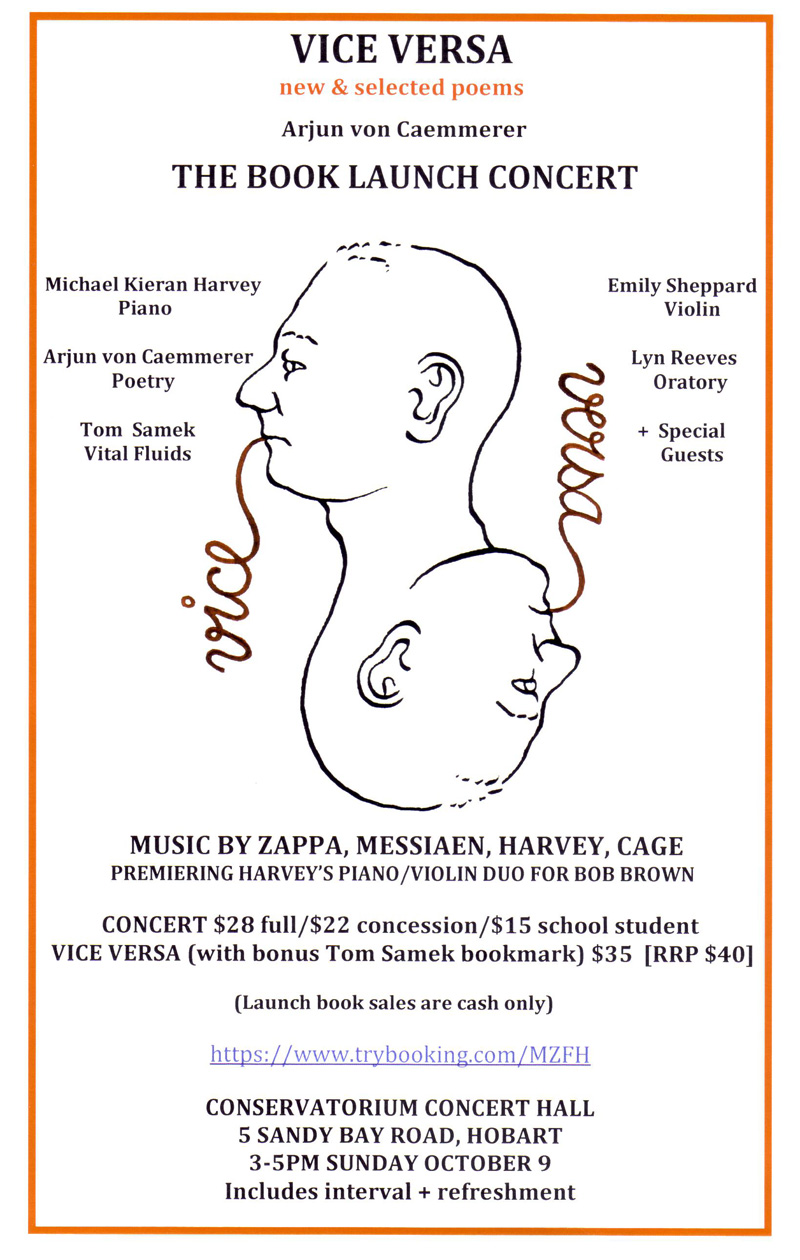 Vice-Versa, a book launch concert at The Conservatorium of Music on 9th October will celebrate the release of Arjun van Caemmerer’s latest poetry collection, with music by Michael Kieran Harvey (piano) and Emily Sheppard (violin). I am delighted to be launching this impressive book. Published by Collective Effort Press, Vice-Versa represents twenty five years of von Caemmerer’s diverse and engaging writings across a range of subjects and styles. The afternoon promises to be an exciting and memorable event, full of surprises. One of the many highlights will be the premiere of Harvey’s piano/violin duo for Bob Brown.